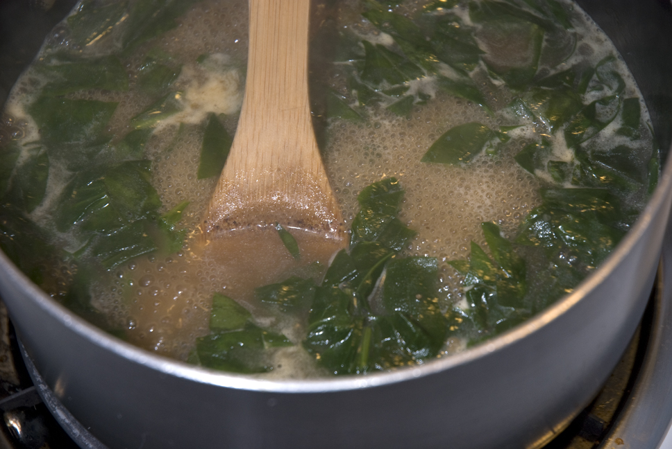 Kevin chopped up a little over a half pound of spinach while I made a white roux and added beef stock to it to make the broth. The chopped spinach went into the broth and simmered for half an hour.